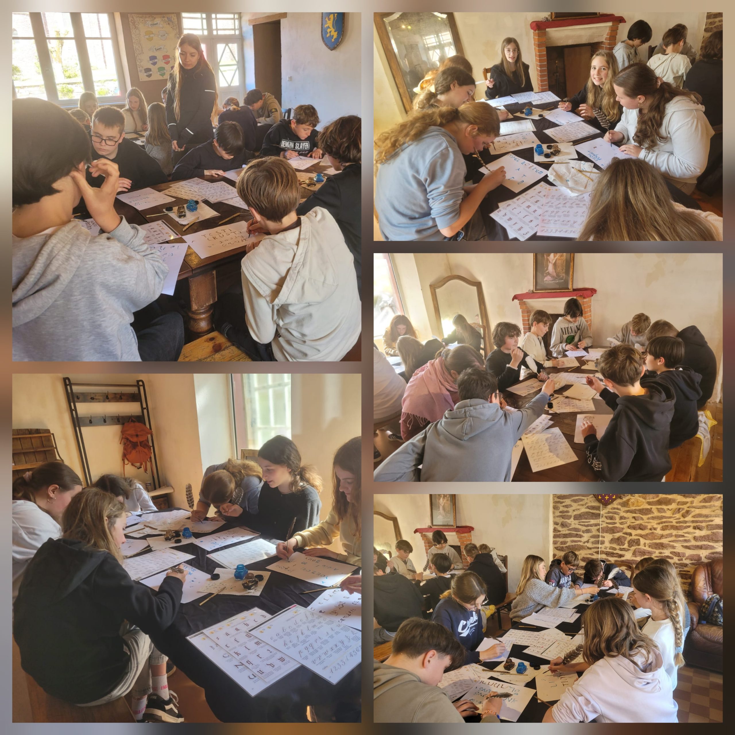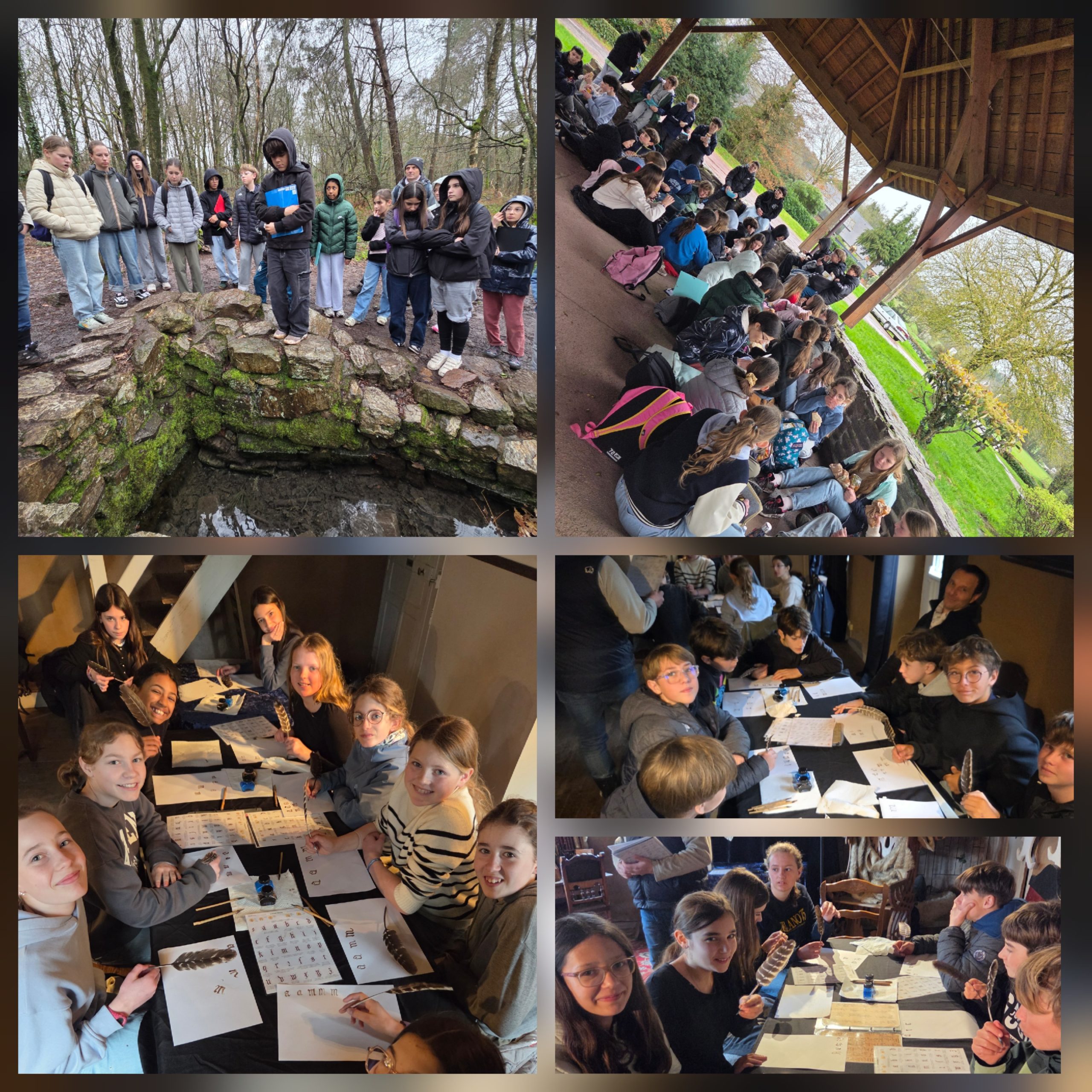 Un guide les a emmenés pour une balade contée au fil de laquelle ils ont rencontré les grands personnages de la légende arthurienne : Merlin l’enchanteur, la fée Viviane, Morgane, le roi Arthur et les chevaliers de la Table Ronde. La visite de la fontaine de Barenton a particulièrement retenu leur attention : selon la légende, il suffirait de verser une goutte de son eau sur le perron voisin pour provoquer l’ébullition de la source… et déclencher une tempête ! Une expérience fascinante que les élèves auraient adoré tenter. Malheureusement, il manquait le fameux bassin d’or, indispensable pour accomplir ce geste légendaire. L’après-midi, un atelier de calligraphie médiévale leur a permis de s’initier au tracé de lettres gothiques à l’aide de calames et de plumes. Chaque élève est reparti avec un marque-page de sa fabrication. Cette sortie a permis aux élèves de mettre en lien les légendes arthuriennes avec les notions de littérature et d’histoire travaillées en classe, et d’approcher concrètement le patrimoine breton.